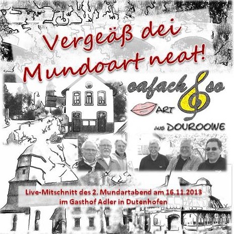 Der 2. Mundartabend am 16.11.2013 im Gasthaus Adler in Dutenhofen - siehe auch u.s. Bericht - wurde aufgezeichnet und die gute Qualität der Aufnahmen hat uns veranlasst, wieder eine CD davon zu produzieren. Die Zweite! Wer die CD zum Preis von 8,00 EUR haben möchte, kann diese ab sofort bei Jörgen Agel oder auch einem anderen Mitglied von "oafach so" erwerben.
