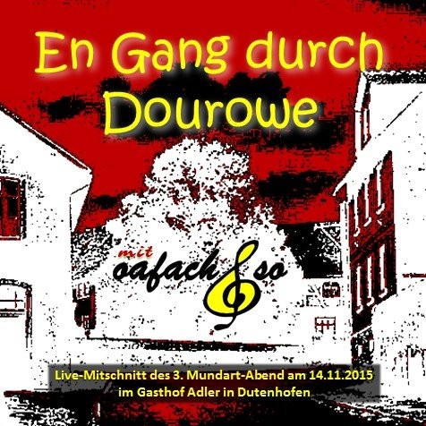 Der 3.Mundartabend am 14.11.2015 im Gasthaus Adler in Dutenhofen wurde aufgezeichnet und die gute Qualität der Aufnahmen hat „oafach so“ veranlasst, wieder eine CD davon zu produzieren. Die Dritte! Neben 15 Musiktiteln sind auch Gedichte, Anekdoten und Geschichten, natürlich alles im „Dourewer Dialekt“, zu hören. Die genauen Titel sind unten zu ersehen.